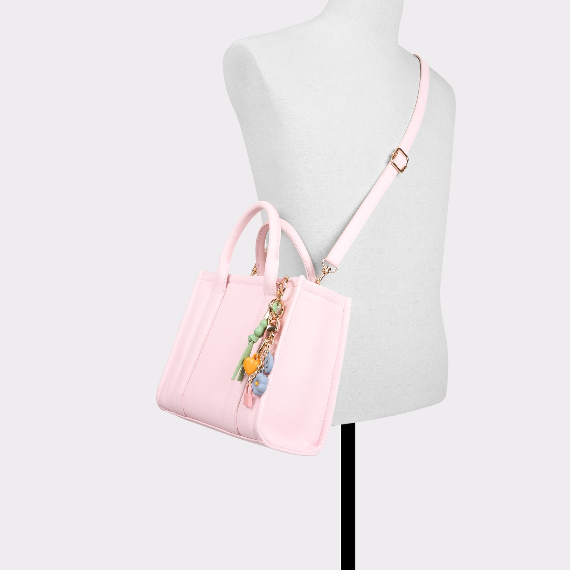 This structured handbag sits pretty in pink with mix and match accessories designed by visual artist Hyperthalamuscorp. Held by the top handle or detachable crossbody strap, this classic style gets a creative pop with a colorful 3D bag charm and patterned interior pouch.