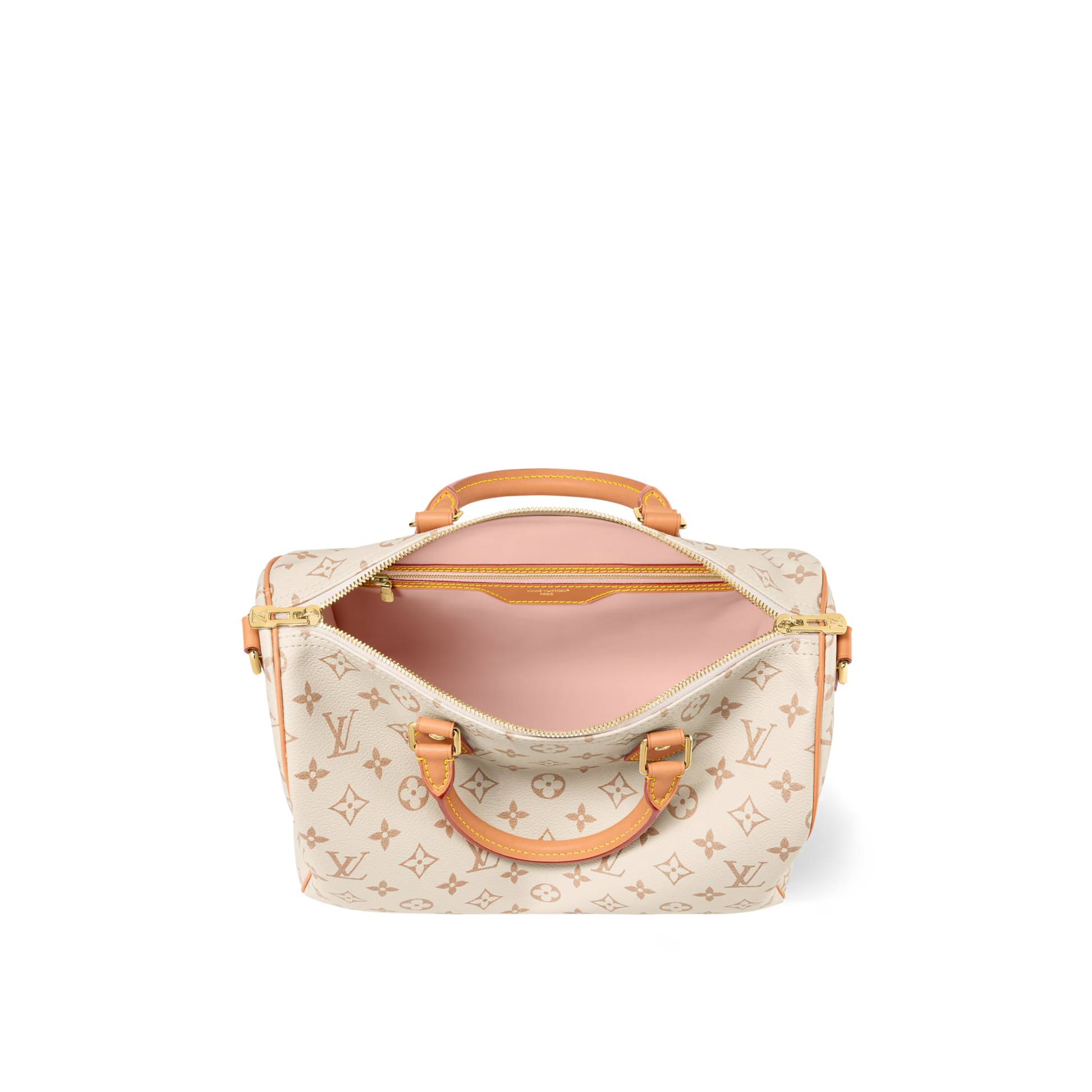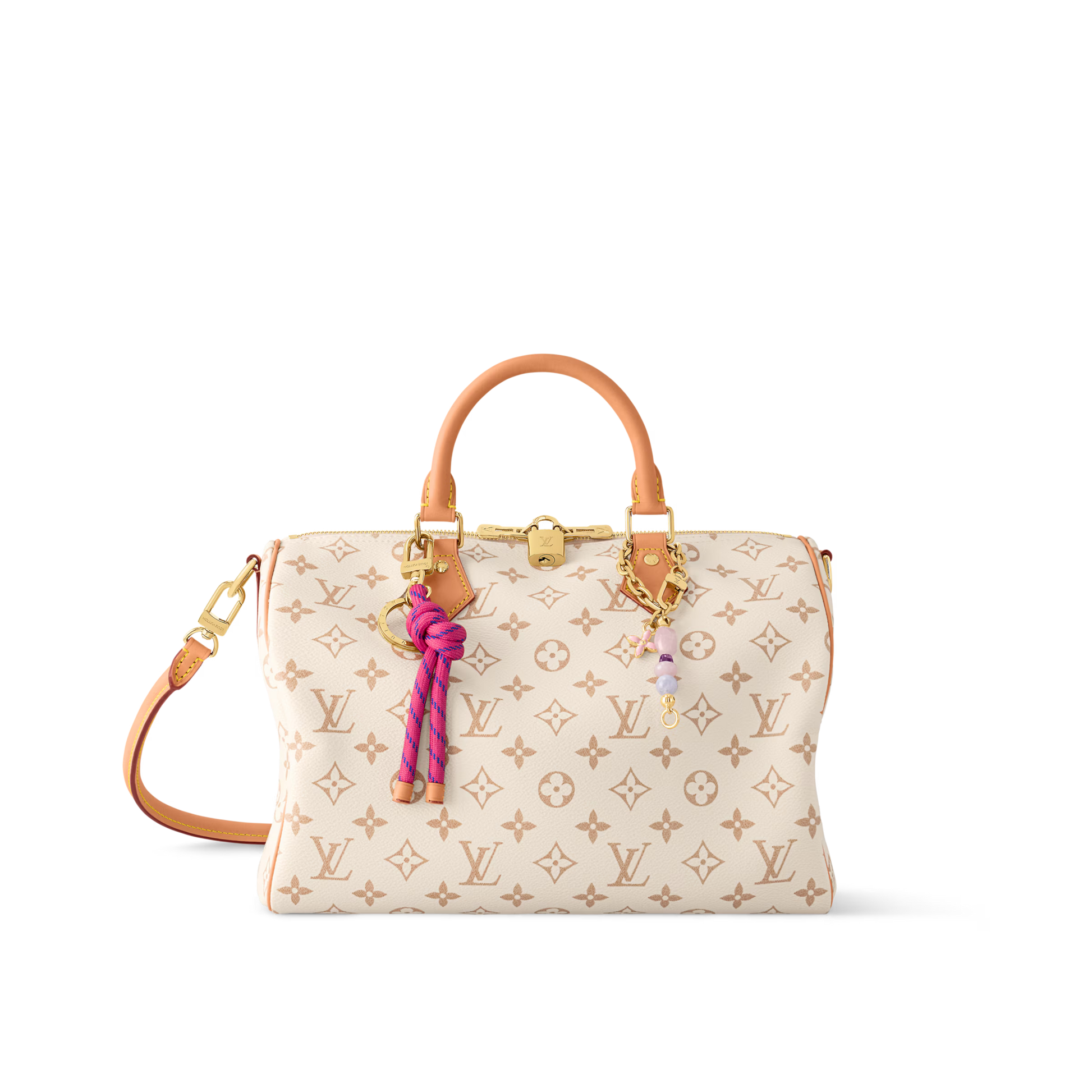 The iconic Speedy Soft 30 Lucky is reinvented with jewel-like embellishments and a contrasting pastel-pink lining to enhance its attention to detail. It is crafted from Monogram Dune canvas with VVN leather trims and is adorned with gold-toned hardware, plus a unique talisman charm and colorful rope knot. Capaciously sized, the versatile design is roomy enough to store a tablet as well as other daily essentials.
